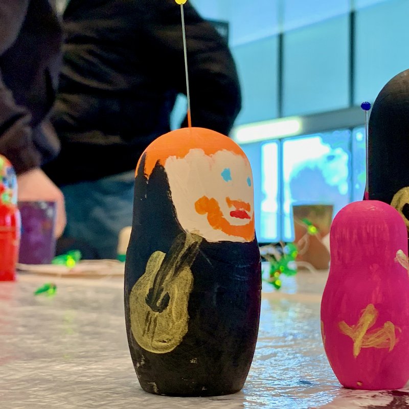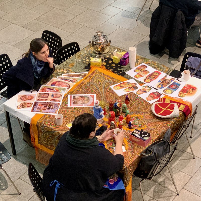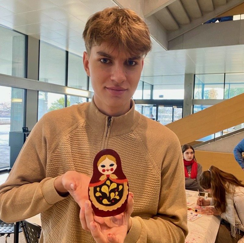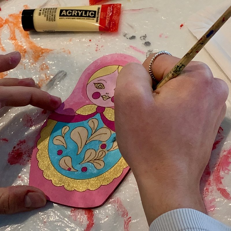 Russischschüler*innen der KEN werden in eine Form der Volkskunst eingeweiht und bemalen unter Anleitung von Elena Morosova Scherer handgeschnitzte Figuren aus einer Behindertenwerkstatt in St. Petersburg: Matrjoschka (bei uns unter dem Namen «Babuschka» bekannt), Tannen, Pilze und weitere Holzfiguren.