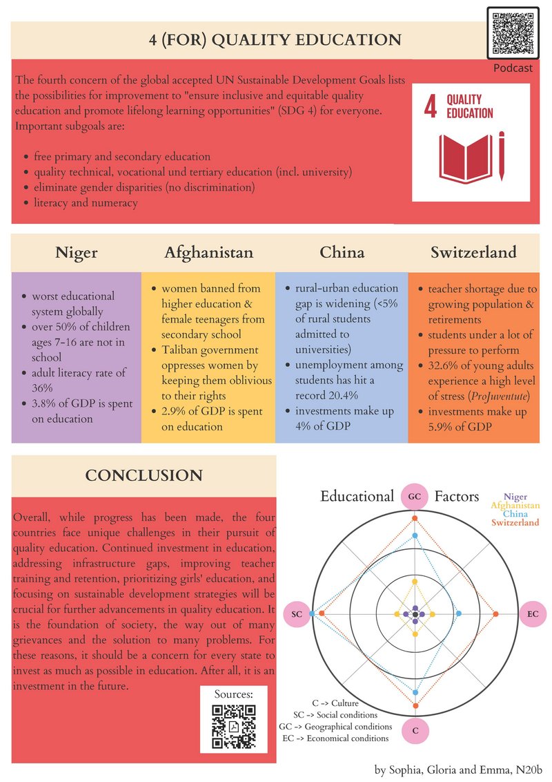 Bei der Recherche zum gewählten Thema wurde der kritischen Umgang mit fremdsprachigen Medien und Onlinequellen und deren Analyse, sowie die Anwendung des Wissens auf die gelernten geografischen Inhalte geübt. Das Erstellen eines digitalen Posters mit einem Podcast in der Fremdsprache sind nun die erforderlichen Endprodukte dieses Projekt. Neben dem sachlich richtigen Inhalt zählte auch die kreative Präsentation der erworbenen Kenntnisse, was sich in gelungenen Produkten zeigte. In diese geben wir hier gerne einen Einblick.